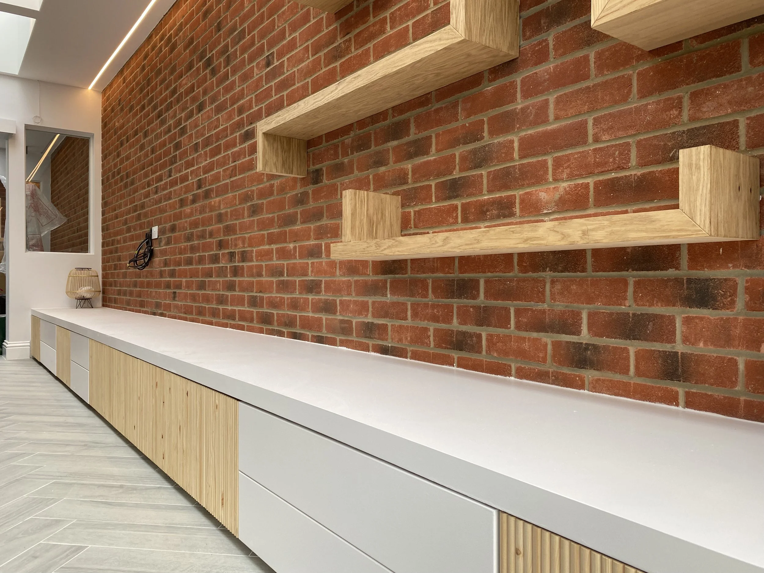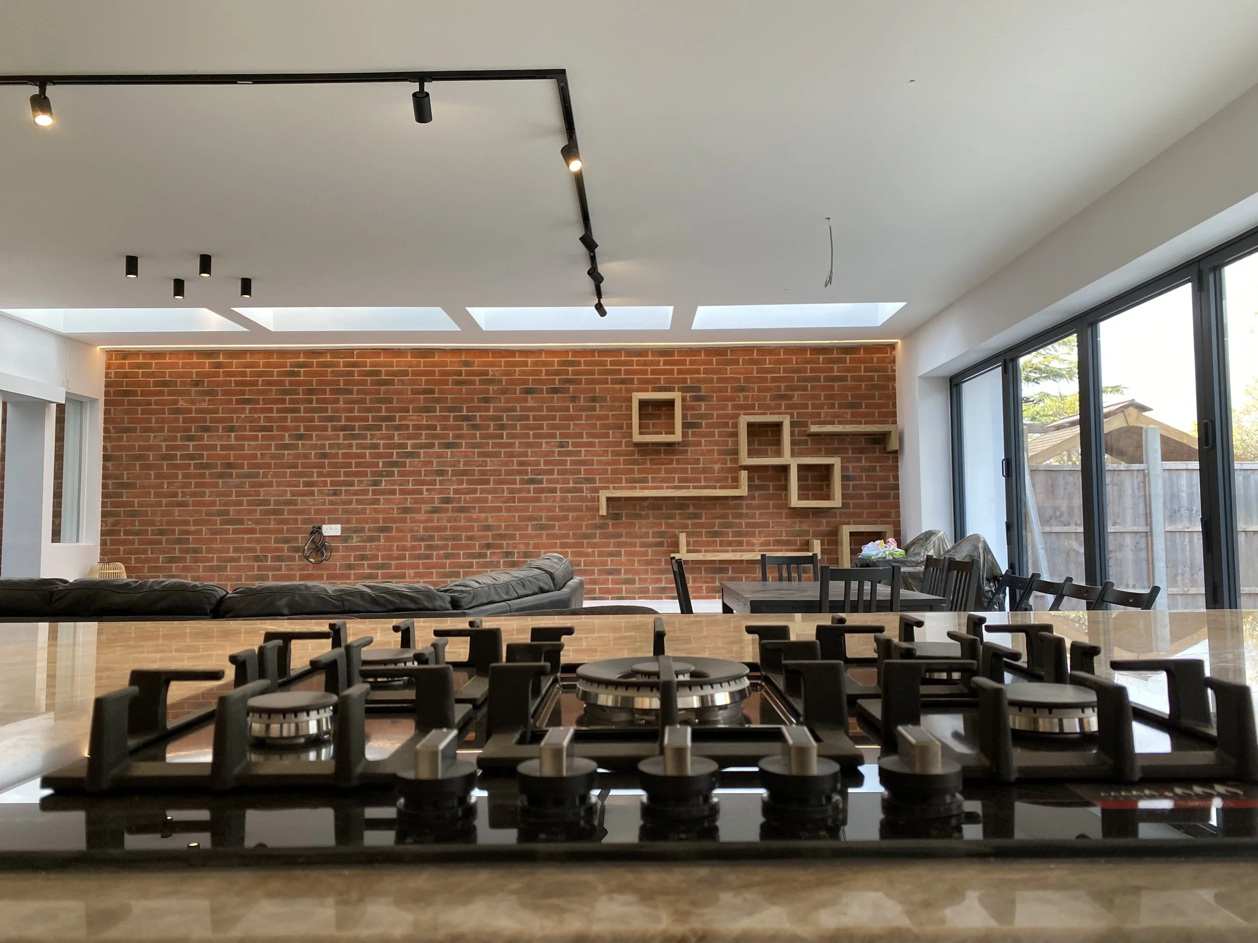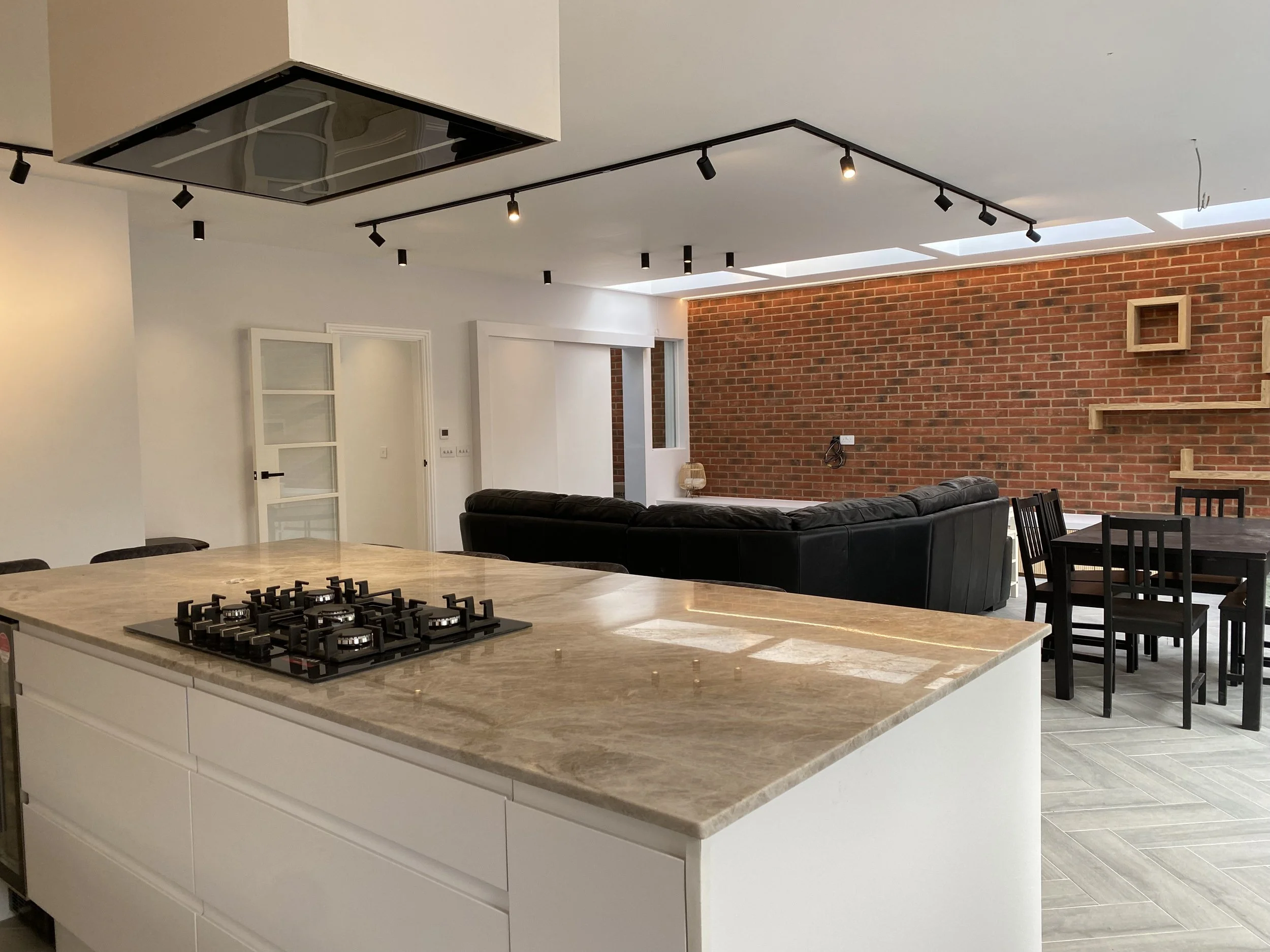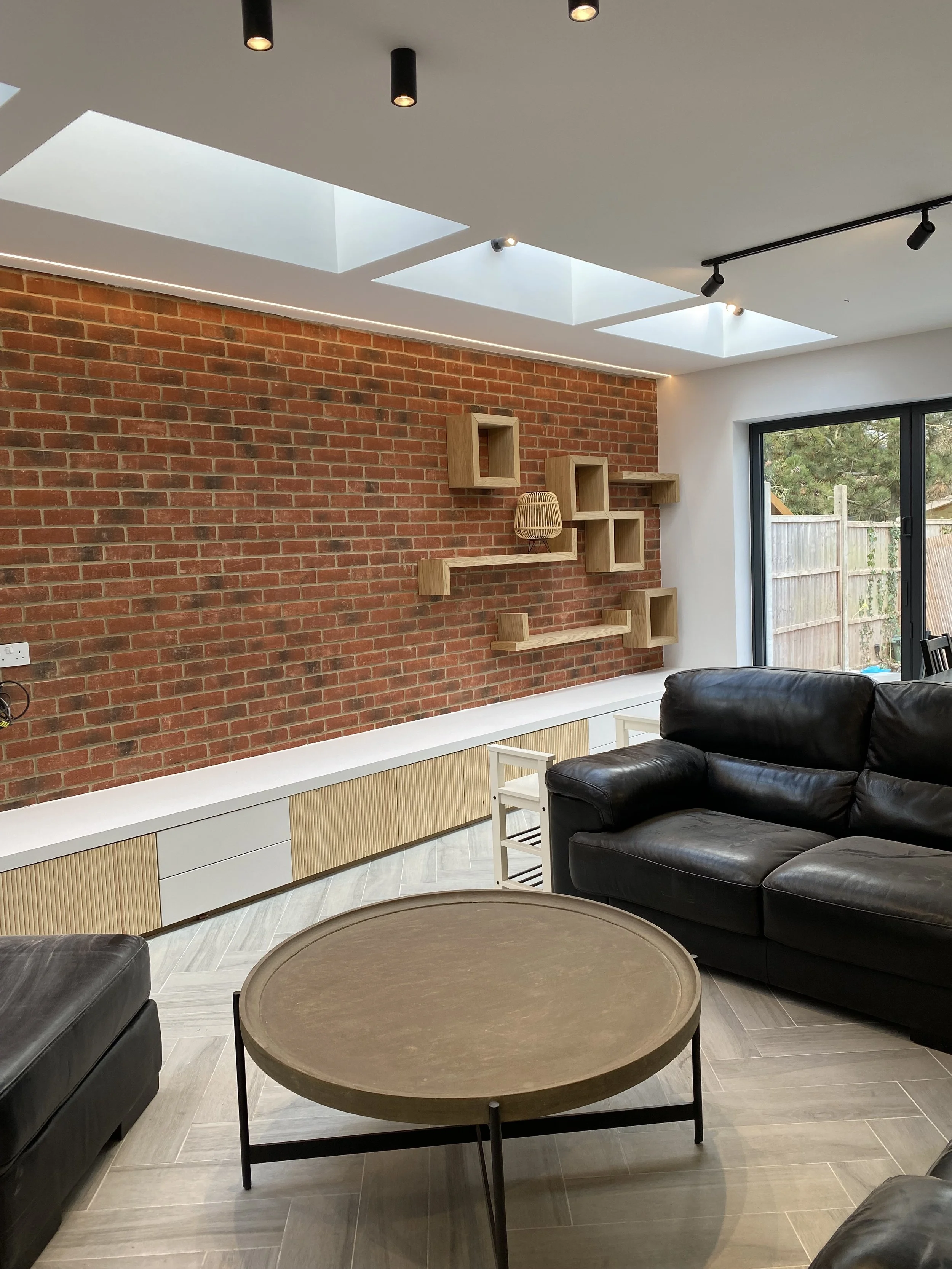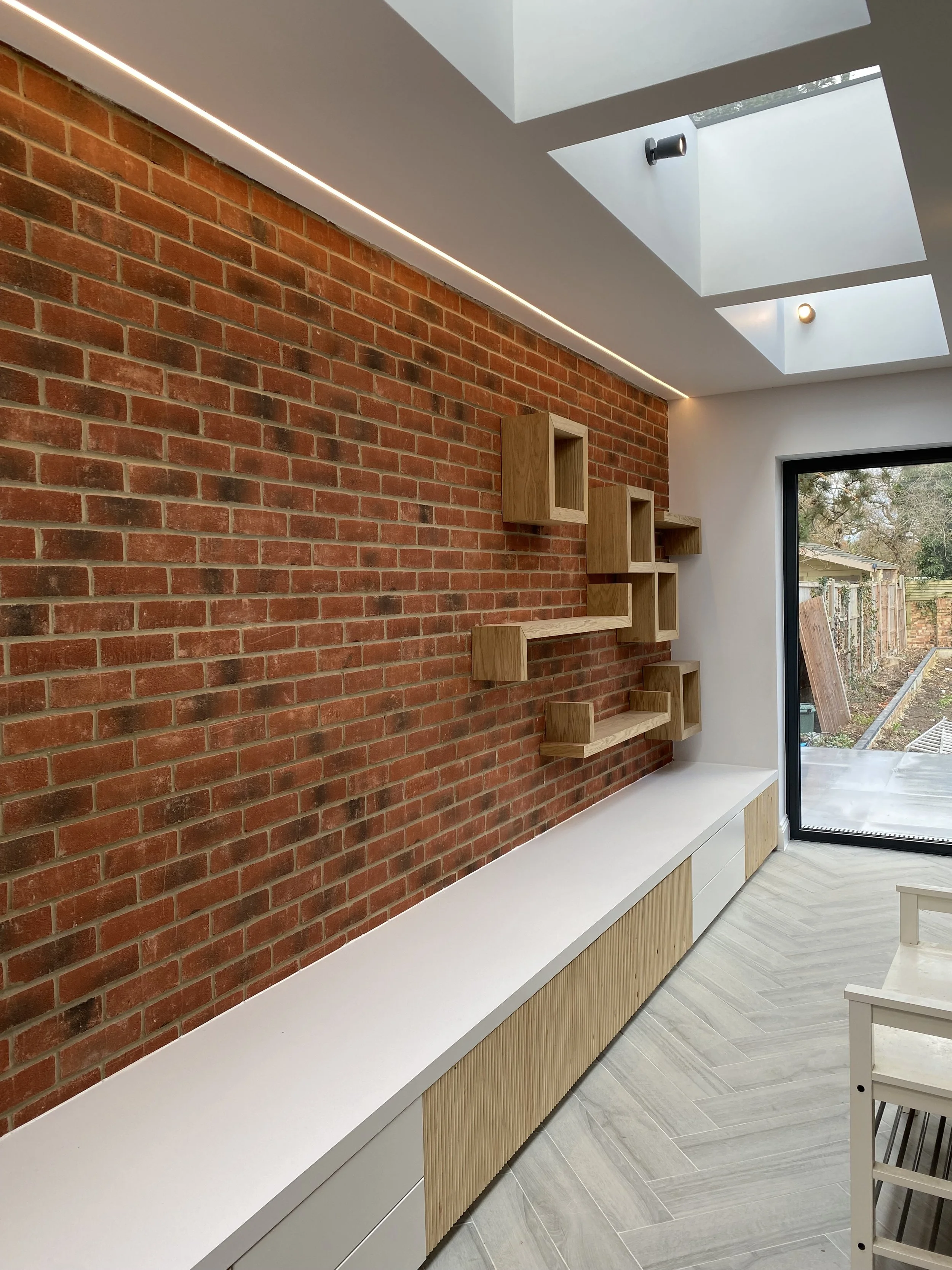 The new side elevation wall was left in exposed brick from the front to back and glass dividing walls meant a view was retained from the parent's office into the children’s room and then further into the open-plan living space at the rear, whilst a run of 6 linear roof lights provide light deep into the heart of this house.